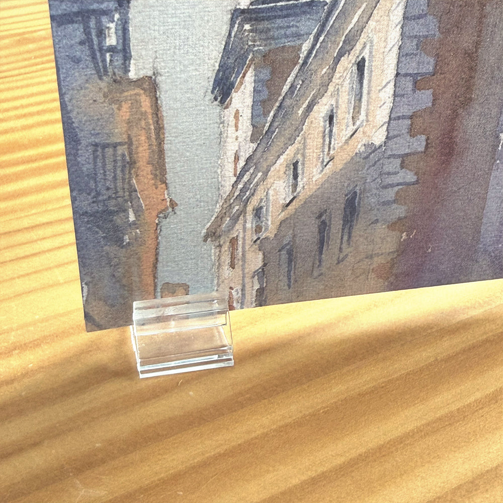 Acompaño las láminas con un clip, con el que se puede colgar en una pared, y con dos soportes, con los que se puede colocar en una mesa, en posición vertical. Dos opciones para dotarle de toda la flexibilidad que sea posible.