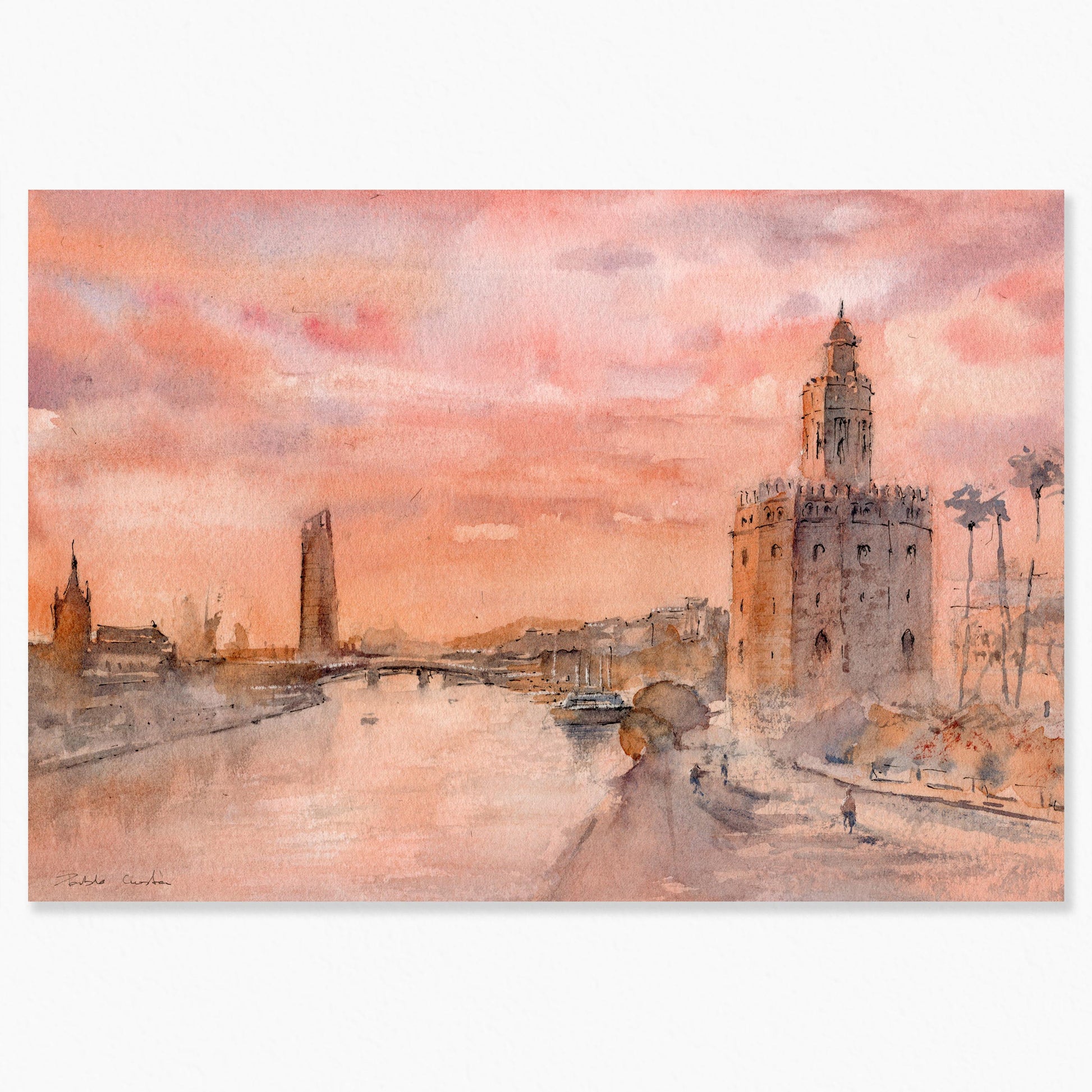 Esta impresión fine art nace de una acuarela original de Sevilla pintada a mano, inspirada en un lugar significativo de la ciudad. La obra busca transmitir su atmósfera única —la luz, el movimiento y la esencia del entorno— sin recurrir a una representación literal.